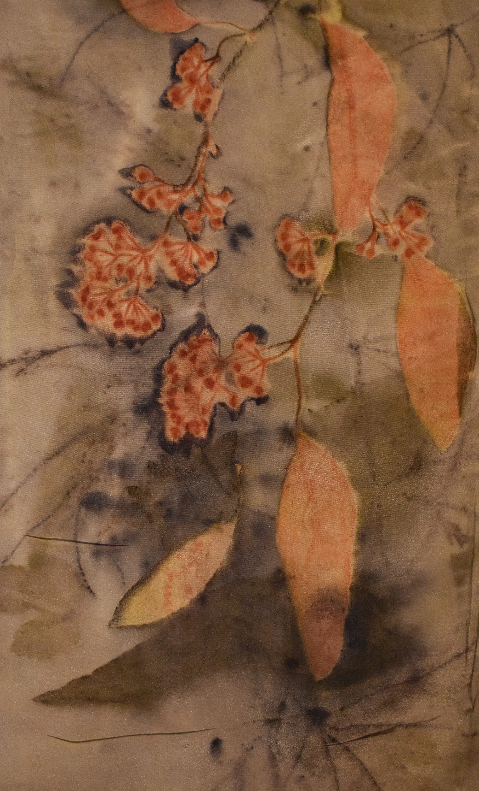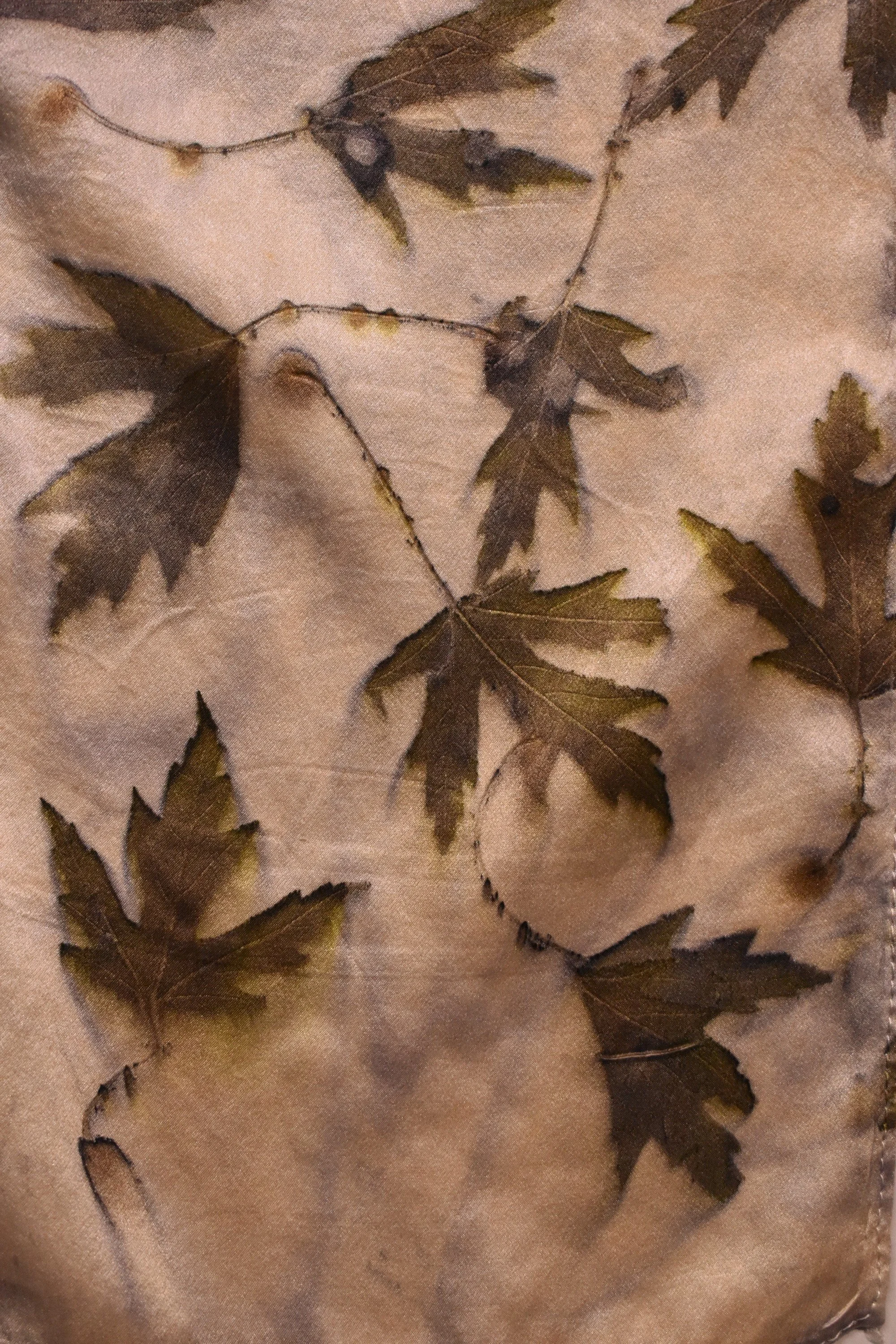 Handmade paper from recycled materials with leaf impressions and stains, handwoven netting, fabric dye, and natural elements.