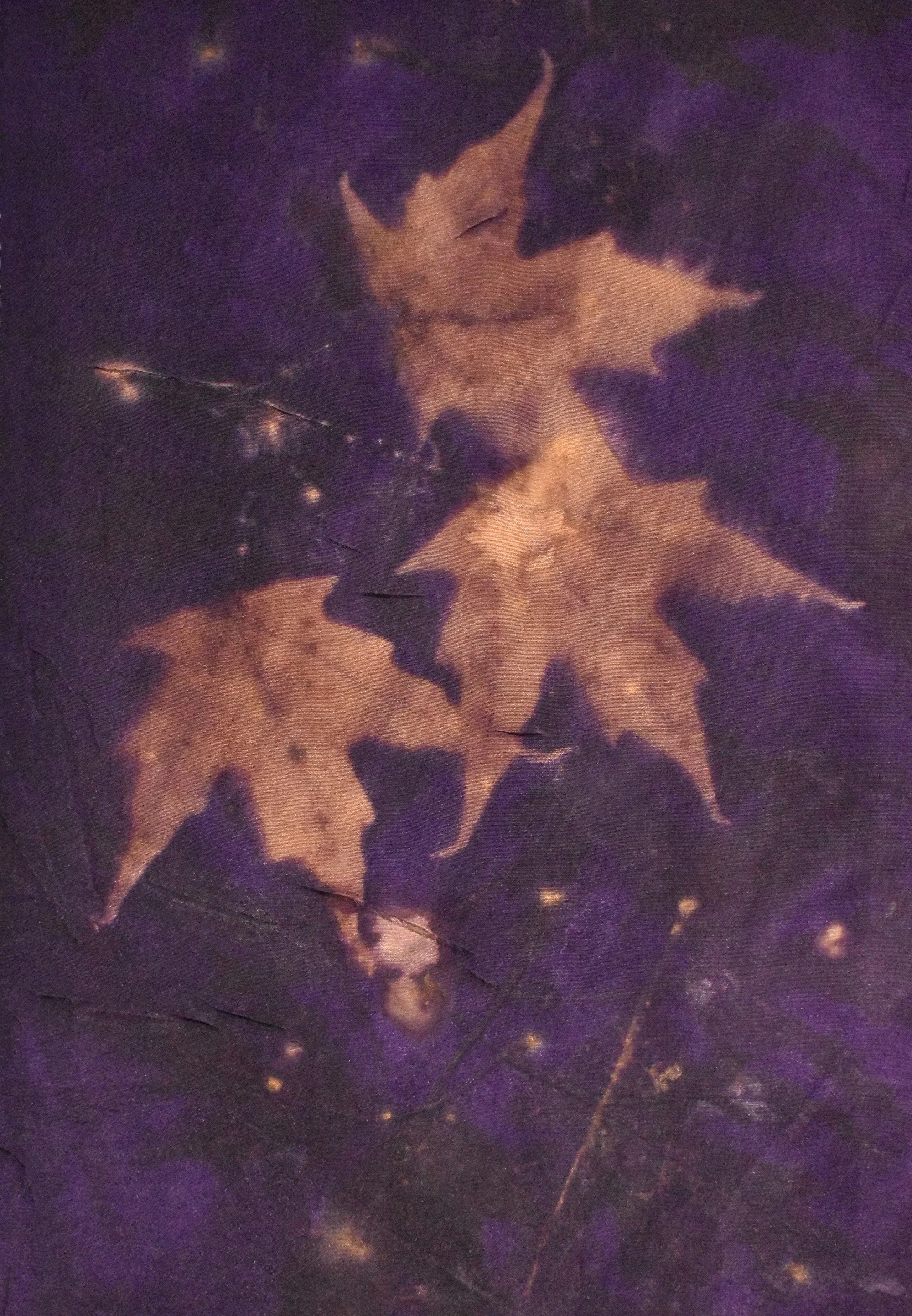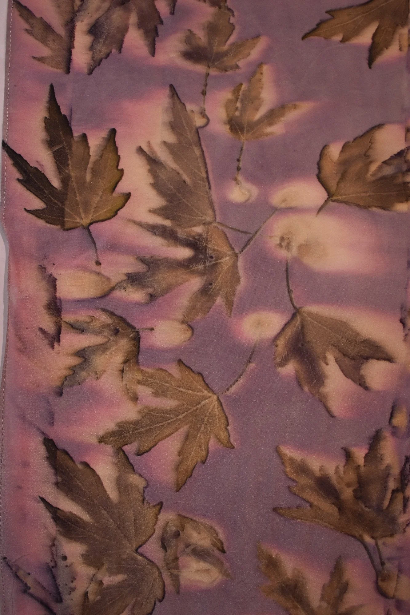 Handmade paper from 100% recycled materials with leaf impressions and stains, fabric dye
